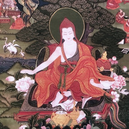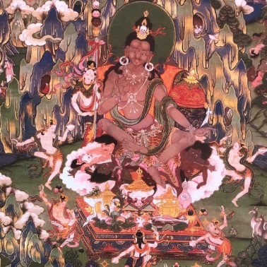 The king Indrabhuti was ruling in the Oddiyana kingdom, which was located in the Himalayan region currently known as the Swat valley of Pakistan. He was loving and caring to his people, and the country was happy and prosperous. But he had been worrying as even his single son had not been of his own from his 108 queens. The king went to consult with an astrologist. He suggested that the king earn virtues by giving wealth and treasures to poor people. The king had given all his wealth and treasures to poor people, leaving nothing. It was not sufficient to reach every poor person. Therefore, he proceeded to Naga Island to find the wish-fulfilling jewels in the palace of the serpent queen. After having listened whole story of the king, the serpent queen gave wish-fulfilling jewels to the king. On his way back to the palace, he arrived at lakes and lotus ponds surrounded by snow-capped mountains. One of the lakes was called Dhanakosha, which was covered with the leaves and petals of lotuses. One particular lotus was unusually huge and did not follow the usual pattern of changing with the seasons. It appeared at the beginning of the monkey year and grew through the seasons. Almost winter, spring, summer, and autumn seasons were about to pass on the tenth day of the tenth month of the monkey year, the lotus opened. The beautiful child, the appearance of an eight-year-old, was sitting inside the lotus. He was dignified, inquisitive, and beautiful. The bees and birds congregated, praising the child. The whole place was pervaded with a lovely musical sound naturally, without music players playing. He was surrounded by dakinies making offerings and even beasts, wild animals, all around paying homage.